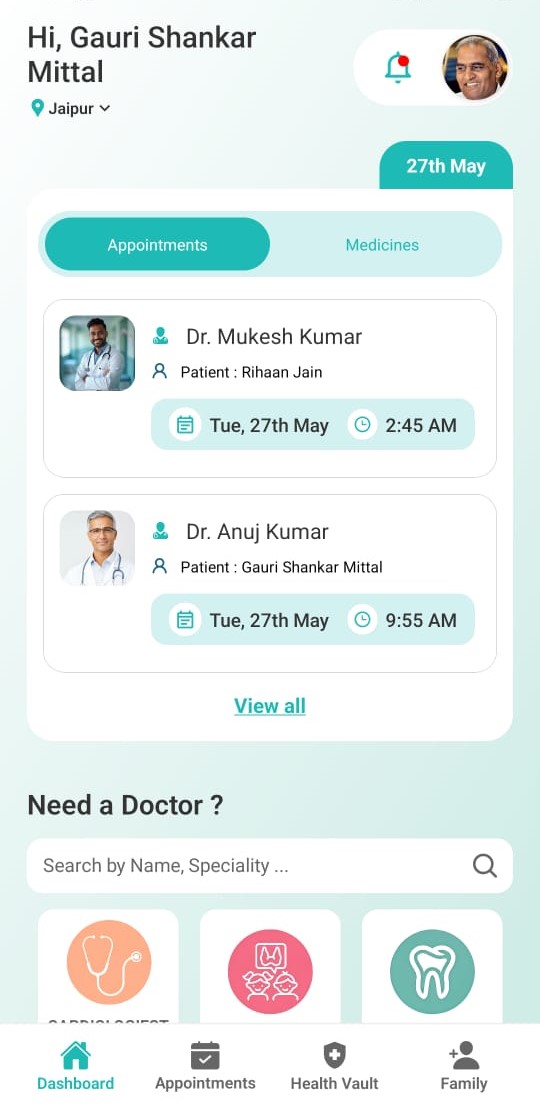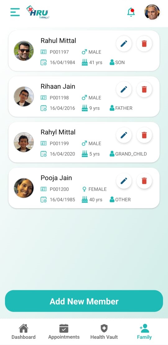 No more hassle of registring each family member seperately using different mobile numbers. Add and manage health for complete family under a single mobile number